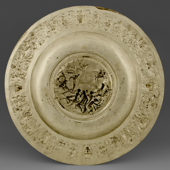 Veliki, bogato ukrašeni tanjur pripada tipu posuda kojih je namjena isključivo ukrasna i izlagao se u posebnom kabinetskom ormaru na divljenje gostima kao dokaz materijalnog i društvenog statusa i prosvijećenosti njegova vlasnika. Ukras površine izveden u tehnici iskucavanja podijeljen je u dva polja: vanjski vijenac koji prati izdignuti rub i spušteni središnji krug.