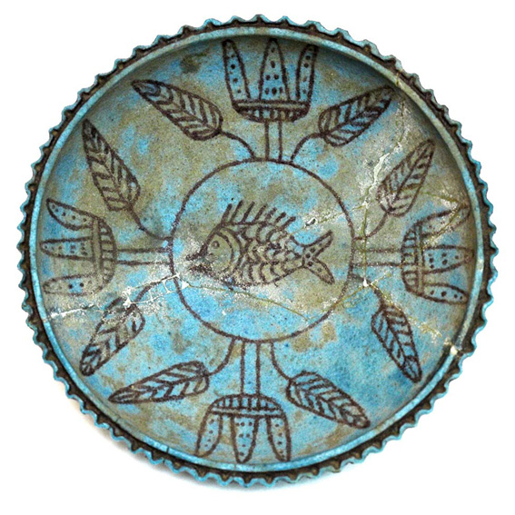 A fish in the centre surrounded by four lotus flowers decorate this simple dish in the turquoise colour, so typical of Egyptian faience. The pattern is simple but carries rich symbolic meaning linked to belief in the afterlife.