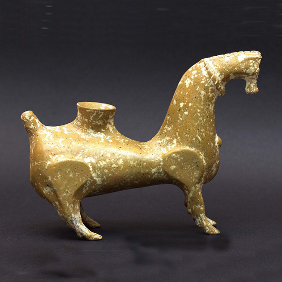 The vessel is shaped like a horse. There is an opening for pouring on the back, and despite the stylized shape the animal features are skilfully emphasized. There is no sign of paint, the only decoration being the relief in the form of a part of the horse harness around the neck.