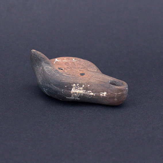 In the shallow channel running from the disc of the lamp to the nose there is a cross. The monogram and cross suggest that the scene is an illustration of the Old Testament Story of Joshua who with Caleb went to "spy out" the promised land of Canaan (Numbers 13, 2-23). This event was the first and one of the most important in the life of Joshua, one of the heroes of the Old Testament, Moses' assistant and successor. The lamp is one of the pear-shaped lamps whose production began in the 4th c., influenced by Alexandria.