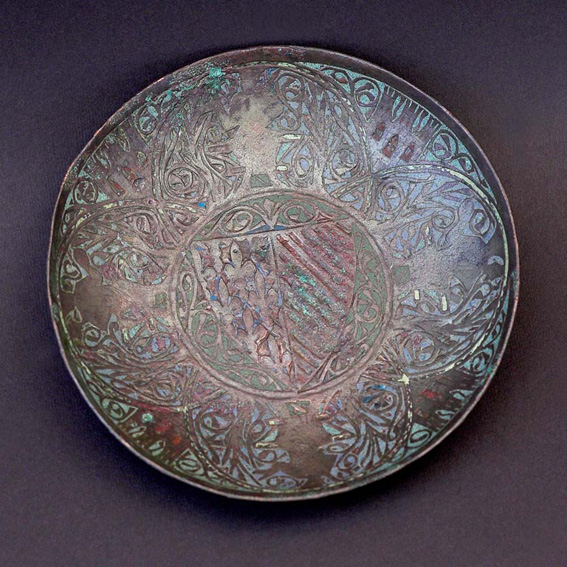 The name gémellion (from Latin gemellus = a twin) is used for a pair of shallow bowls for washing hands, so that the water pours over the hands, from one bowl into the other. Most gémellions made in Limoges are decorated with worldly scenes and coats of arms, so we may presume their use was secular. The surface enamel of this one, like most of the others, is worn since the copper was constantly exposed to water, so the decoration has been reduced to shallow relief.