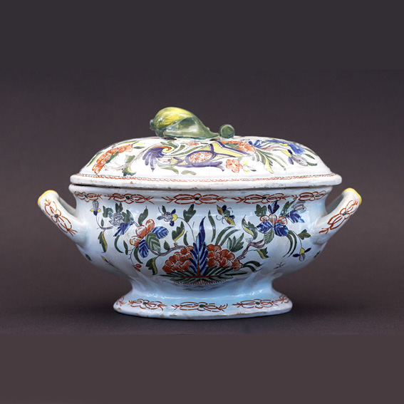 A potbellied oval tureen standing on a circular foot with slanted handles on both ends. It curves out then in with a ribbed pattern on each side, to the level of the handles. The central part is smoother. The low round lid exactly follows the shape of the main body.