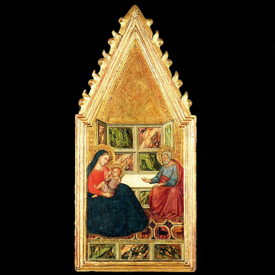 The late Gothic, gold frame with its pointed arch, and gold background and the abstract setting of mottled marble and floor tiles with mythical animals from the medieval bestiary lend an air of unreality to this picture. The use of multi-coloured marbles is typcial of late Gothic architecture in Siena. "Vertical perspective" (Joseph is at a higher level) gives the impression that the Virgin is in the foreground and Joseph behind her. The Virgin is a typical idealized type of a young maiden with almond-shaped eyes, thin straight nose, and small mouth in the tradition of Duccio's Virgins.