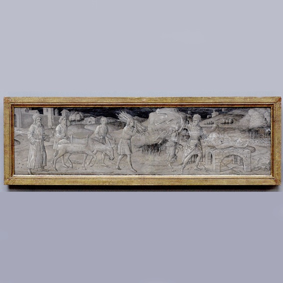 In Gozzoli's painting the angel has brought a lamb to take Isaac's place. In iconographic terms, Abraham's sacrifice prefigures Christ's sacrifice on the Cross, while Isaac, carrying wood on his back, prefigures Christ carrying the Cross on which He is to be sacrificed.