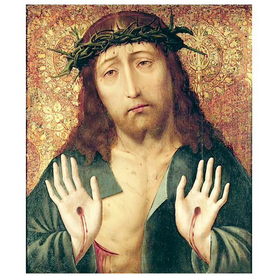 This iconographic motif is not based on any Biblical text but has its inspiration in mysticism and the cult of the body of Christ (Corpus Christi), which was widespread in the late Middle Ages. It is a devotional image intended for meditation. The expression of the suffering but living Christ denotes His human nature, the display of His wounds indicates the Resurrection and His raised hands reveal His role of Judge in the Last Judgment.