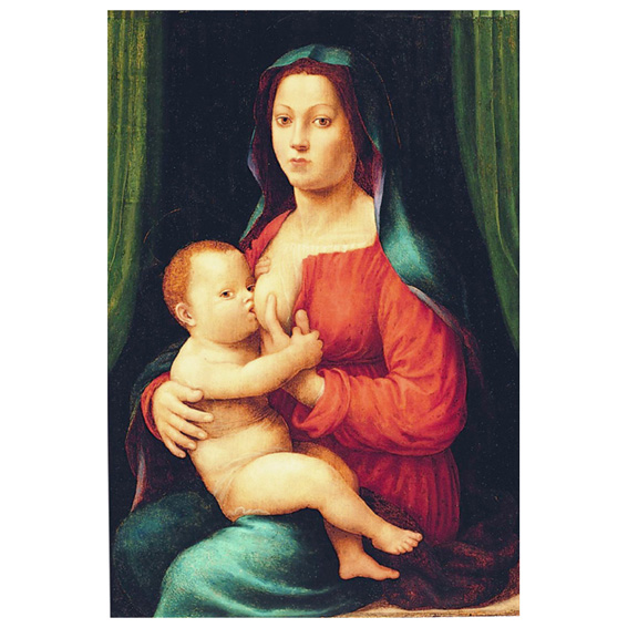 The Virgin Galaktotrophousa - a representation of Mary nursing the Infant Jesus, widespread in the West from the late Middle Ages - acquired the humanistic properties of a real nursing mother with the advent of the Renaissance. As if the scene were set on a stage, the seated Virgin is portrayed in a left three-quarter view down to her knees, facing the spectator, encircled by an open light green curtain and a dark brown background.