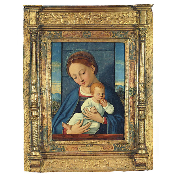 This painting of the Virgin and Child belongs to the High Renaissance but various elements are reminiscent of Gothic: the blue cloak, the blue screen behind the Virgin, the gold frame with late Gothic tendrils and pillars, the surrounding plant ornamentation. The artist has copied the porcelain-like features and firm delineation of the early Dutch painters.