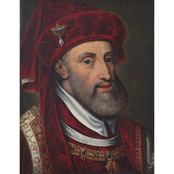 Charles V (1500-1558), Emperor of the Holy Roman Empire, is shown in front of a dark, olive-green background, in three-quarter right profile. He is still a youngish man, with a look of intelligence on his bearded face, with grey-blue eyes, a slightly curved nose, an enigmatic smile. He is clad in the rich, ruby-red velvet garments of a knight of the Order of the Golden Fleece