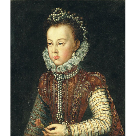 Catalina Micaela (1567-1597) was the second daughter of the Spanish King Philip II Hapsburg, and his third wife Isabella of Valois, daughter of the French King Henry II. In 1585 she married Prince Karl Emanuel I of Savoy. Her elder sister, Isabella Clara Eugenia was also born of Philip's third marriage and in 1599 married Albrecht VII of Austria, and as Regent of the Spanish Crown from 1621 governed in the Low Countries. There is a full length portrait of both sisters as children by the Spanish royal court painter Alonso Sánchez Coello, the Prado Museum.