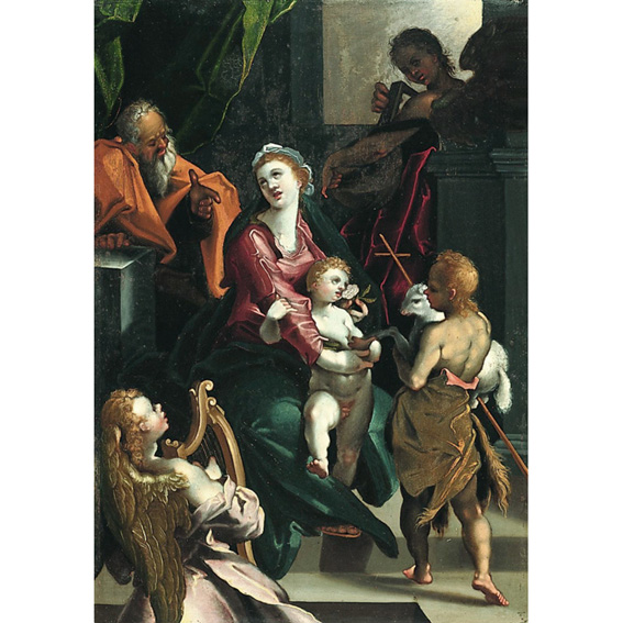 St John the Baptist, a lamb in his arms, the Virgin and Child, the aged St Joseph and the curtain are portrayed in a steep diagonal in accordance with German Mannerism. This basic compositional diagonal is intersected by a steeper one that connects the two angelic musicians: one brightly illuminated in the foreground and the other eclipsed in far perspective, conspicuous against the light of an open window. The light glides down the animated figures and undulating drapery, vibrating in a vivid chromatic scale. Architectural elements produce the impression of spacial "flight" into depth.