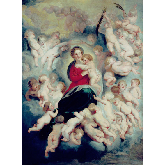 The composition is defined by an oval spiral in which the children's bodies are grouped in clusters. The shapes in the mass gradually strengthen from left to right, creating an illusion of unbalanced and frenetic movement. The several sources of light make a chiaroscuro effect, by which the foreground and background are dynamically connected. The boys' faces as well as Mary's are similar to those in the painting The Virgin and Child with Garlands and Putti, which Rubens painted with Jan Brueghel between 1618 and 1620, so this painting can be dated to the same period.