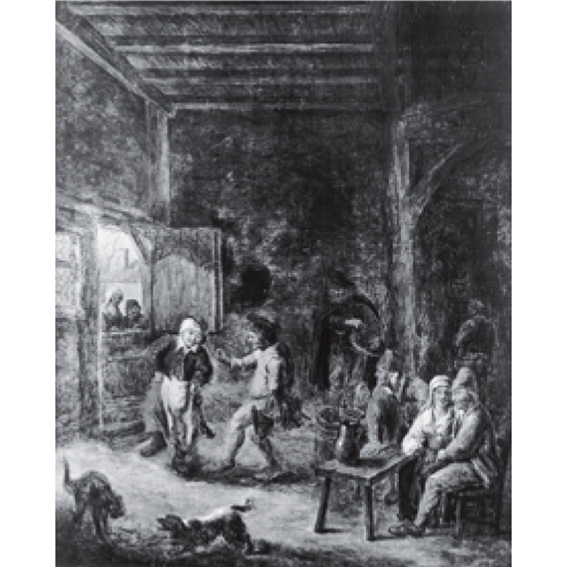 A group of peasants enjoying themselves in a village tavern. One pair is dancing to the music of a figure in the background playing the bagpipes, other figures watch the scene. Two dogs are playing in the foreground. The painting is executed in dark monochrome tones of brown which was typical of Teniers in his early phase (1635-1651). A strong light enters from an opening at the back producing a dramatic Baroque chiaroscuro atmosphere. Teniers took this from Adriaen Brouwer who strongly influenced the early years of his work.