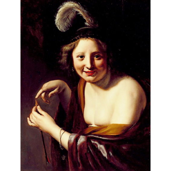 The artist is fascinated by the interplay of surfaces and does not engage in a psychological study of the character, focusing instead on the allegorical meaning: an arrow as a symbol of Love (Cupid's arrow) and a roguishly tilted feather in the hair as a lure of adventure.
