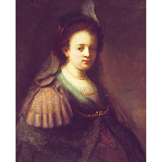 This costumed portrait of pregnant Saskia van Uylenburgh (1612-1642), Rembrandt's wife, can be interpreted as a Vanitas portrait due to the way she proudly wears her feathered hat and precious jewellery, symbols of transience. The light coming from above left illuminates the right side of her face, neck and a part of her bosom, creating a sharp border with the dark shadow on the left side of her face and clothes. Although influenced by Rembrandt's portraits of Saskia, this work by his pupil Flinck lacks both the characteristic inner radiance achieved in Rembrandt's portrayals of his wife and the structuring by means of flickering hues; still, it is a fine work of art with clearly outlined volumes and broad coats of light and dark olive and brown shades.