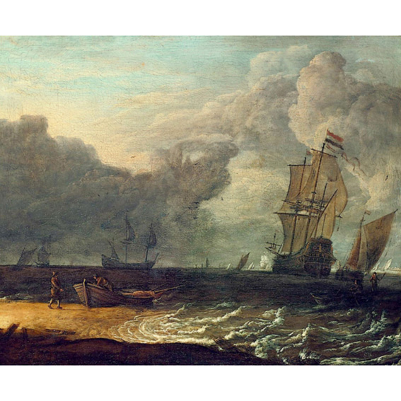 The tones of this dramatic Baroque seascape, with its whirling clouds, heaving sea and ghostly small white sailboats on the horizon, fade away into infinity. The painting appears to be realistic, yet the resplendent horizontal bands of light in the fore and background are illusory. The vast slate-coloured sky sets the tone of the painting, contrasted to the horizontal dark brown bands of the land and sea. The staffage figures of the fishermen on the left symbolize the littleness of man in comparison with the might of nature. The impending storm, tonally achieved, evokes a feeling of anxiety.