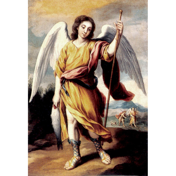 On this painting Raphael's figure dominates the foreground. His billowing clothes, his right foot stepping out, a traveller's staff in his left hand, and great outspread wings give the impression of the light movement of a celestial being. In his right hand he carries the fish that Tobias caught in the river Tigris on his advice, and which is the attribute of doctors and the symbol of Tobit's miraculous healing.