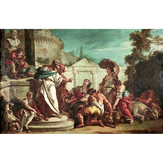 St Paul the Apostle, a Jew born in Tarsus under the name of Saul, at first persecuted Christians until he was blinded by a great flash of light from Heaven, the Lord's sign that converted him. He regained his sight in Damascus when Ananias laid his hands on his eyes and, in praise of the Lord, he changed his name to Paul and began spreading Christianity. He is portrayed on his mission to Asia Minor, preaching in Lystra.