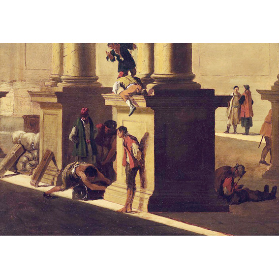 This is an unusual genre scene for Canaletto, the renowned painter of Venetian city scenes (veduta) with a broad blue sky as the background. It depicts the sunlit part of a Venetian marketplace with emphasis on the column bases, next to which the merchants displayed their goods.