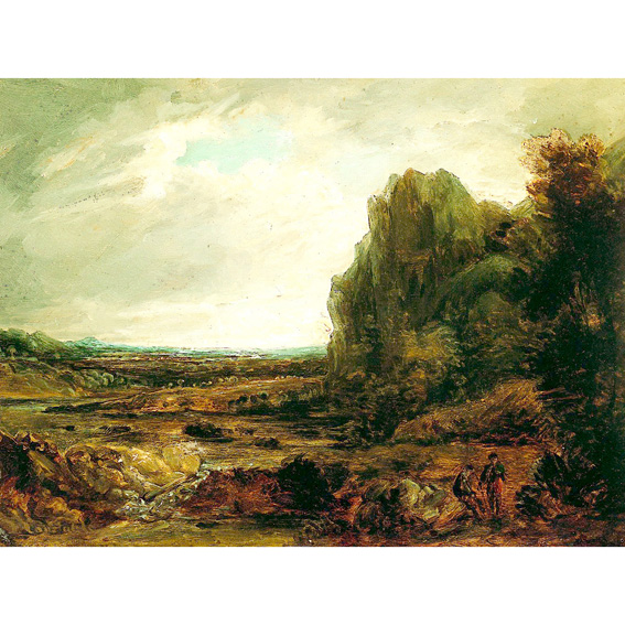 In this sketch in oils Constable has taken a stept towards "pure landscape" and the two human forms in it are hardly discernible. He has given a bold presentation of landscape in general rather than concentrating on individual details, and the sea is no more than a green line in the far distance. With a thickly charged brush he painted free representations of background trees and bushes with small and large rounded shapes. The basic colouring is brown and pearly-blue which call up the simple drama of a natural scene.