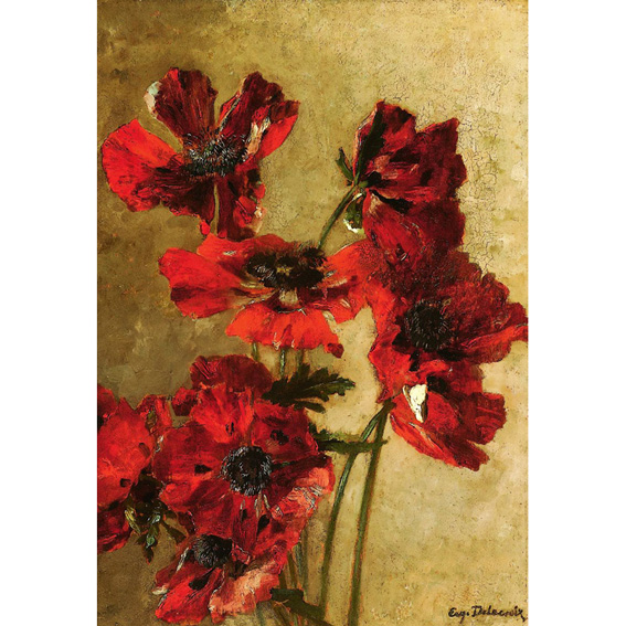 This flower study, a bunch of poppies in full bloom, was painted in generous smudges of fiery red in front of a neutral background, perhaps a wall. The strokes are full of energy and vitality, and their changing direction links the patches of colour into a unique play of blooms and petals. Delacroix painted about fifteen "still lifes with flowers" in which poppies, more often combined with other kinds of flowers, are not rare. George Sand, who met the artist in 1833, the year from which his earliest known paintings of flowers date, spoke about his enthusiasm for flowers.