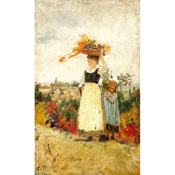 Pissarro painted similar scenes of field work, dominated by women in various everyday jobs, while he was a guest of his friend, the artist Ludovico Piette in Montfoucault (Mayenne) in Brittany. Pressed by poverty, Pissarro accepted Pietto's hospitality and he and his family spent the winter of 1874/75, and the autumns of 1875 and 1876, on Piette's farm. It was probably on one of those autumn days that this scene from the grape harvest was painted.