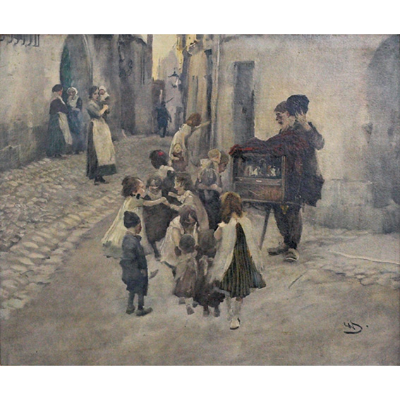 The fleeting dance of children takes up the foreground and the natural movement of the street organ-player and a women standing a little beyond them. Clearness is achieved by controlled contrast of light and shade. The red cloth over the street-organ, the source of the music for the dance, produces an accent of its own, as if the artist wished to conjure up the music by various gradations of colour. Street Musician is an attractive genre scene and typical of the Düsseldorf School.