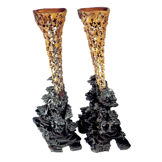 The horn of the rhinoceros was considered to have a miraculous power against poison and consequently goblets were made of it. Horns were boiled and burnt before carving in order to make them softer so that they could be pierced with ornaments, like this one in the form of a vine stem with clusters of grapes. A Taoist landscape is carved on each of the wooden stands.