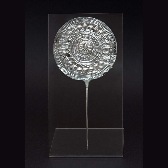 Vrh je igle tehnikom iskucavanja proširen u disk i ukrašen na način karakterističan za taj tip ukrasnih igala. Središnji dio diska zauzima prikaz lavlje glave obrubljene širokom trakom točkastog ukrasa dok je vanjski rub ukrašen naizmjeničnim nizanjem plodova šipka i lišća. Osim lavlje glave u središnjem dijelu diska ovaj tip igala može biti ukrašen i prikazom glave Ashi - božice plodnosti i rađanja čiji su simboli lav i nar.
