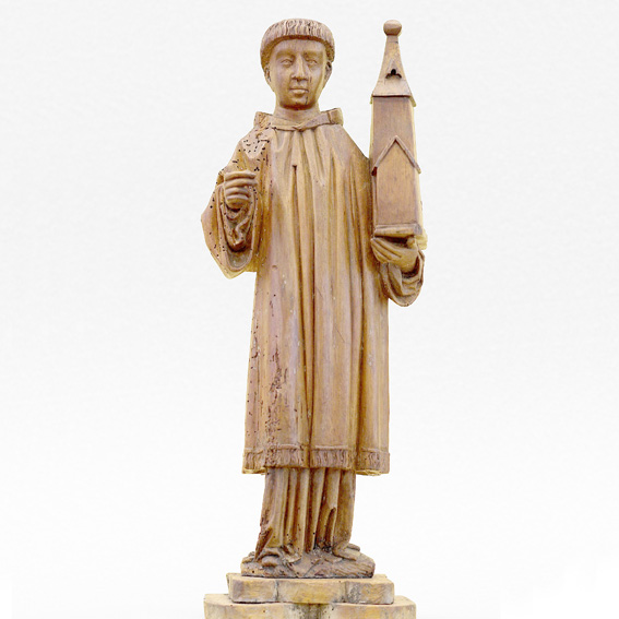 Uspravni kip muškarca odjevenog u redovničku odjeću, predstavlja sv. Wolfganga, biskupa kanoniziranog već u XI. st., čiji se kult posebice širio po njemačkim krajevima. Blago povijen lik lijevom rukom pridržava model crkve sa zvonikom, jednim od svojih atributa.