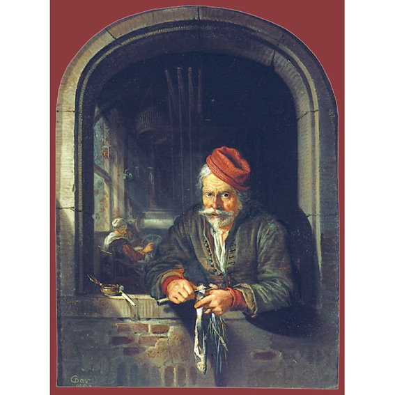 Slikar je iz holandskog života nižega građanstva izabrao genre-temu starca koji čisti ribu i starice koja u pozadini tka s nakanom da prikaže čar i toplinu predmeta svagdanje upotrebe.