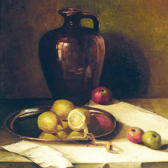 Iz bogato nijansirane tamne pozadine izdvaja se mrtva priroda u ljestvici tonova koja dosiže vrhunac u toplom žutilu limuna, kojem je tonski podređena cijela slika. Utjecaj impresionizma uočljiv je u naglašenoj igri odraza svjetla na metalu i voću.