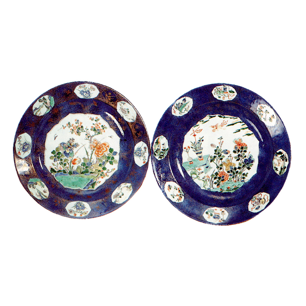 Par tanjura ukrašen je u složenoj tehnici višestrukog pečenja porculana. Najprije se na nepečeno tijelo tanjura puhanjem kroz bambusovu cjevčicu nanosio kobaltni prah, a mjesta koja su trebala ostati neobojena prekrivala su se papirom. Potom se nanosila caklina i tanjur se pekao na visokoj temperaturi pečenja porculana od oko 1300°C. Oslik unutar kartuša izvodio se emajl-bojama na pečenoj caklini.