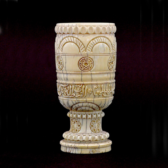 Made of a single piece of ivory with the bowl hollowed out and decorated on the outside. A large crack on the interior of the bowl is seen on the outside also. The base is double profiled and decorated with a simple ribbon ornament. The foot is decorated with a row of sixpointed stars in a circle with circles between their points.