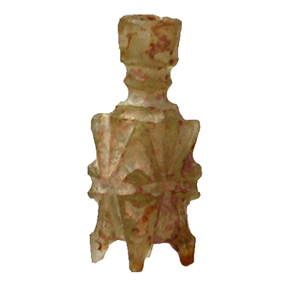 The bottle is a typical example of Egyptian glassware of the reign of the Fatimids (9th-11th c.) influenced by a desire to reproduce the illusion of naturally formed crystal. The small, thick walls successfully met Fatimid demand for geometrical patterning to evoke the clear forms of rock crystal.