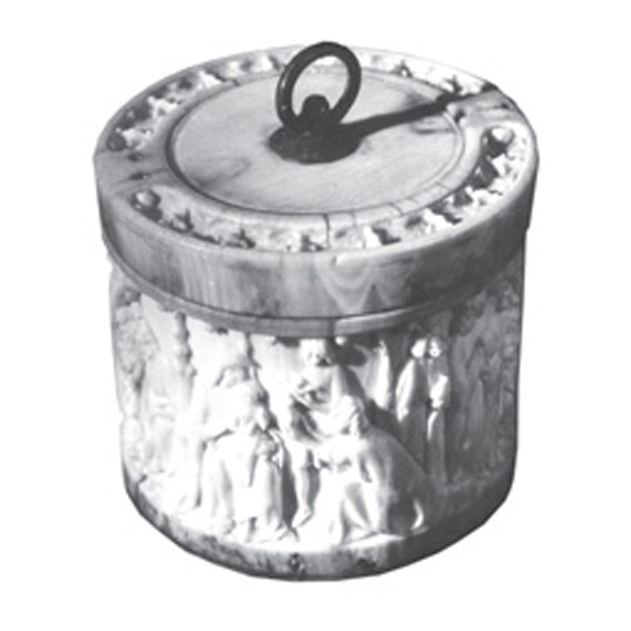 The way the lid fastenings are arranged divides the pyx into two semicircular fields, each of which bears a single scene from the Life of Christ and each in a minimal architectural setting. In the scene of the Three Kings the Virgin holds Jesus, His hand raised in blessing, on her lap. Melchior, the oldest, is kneeling and offering his gift, Balthazar is middle aged and points with his hand to Heaven, Gaspar is the youngest. A young man is also shown clothed in a short shirt and, divided from Mary by a post, is an old man his head on his hand.