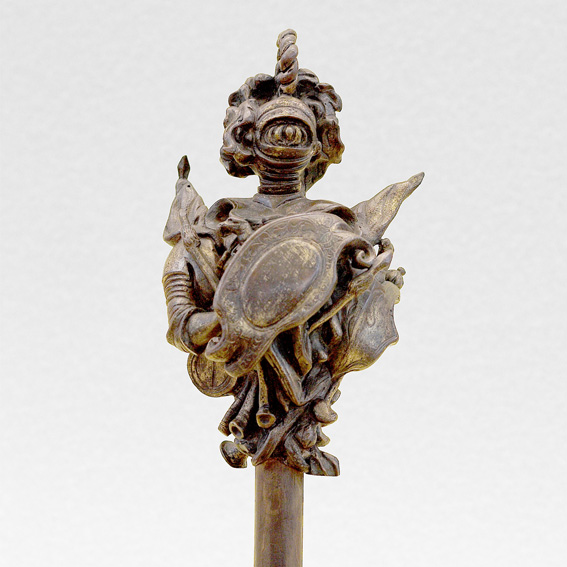 Among the Greeks and Romans a trophy represented captured weapons which were hung, in a certain arrangement, on a tree or a pillar in the battlefield immediately after the battle, or kept in a temple. As a decorative motif it had already appeared in Greece, and it was also common on Roman monuments. It was rarely used during the Renaissance period, but it was rediscovered in the Baroque. This extremely interesting piece was probably part of a larger composition, or the decorative top of a flag.