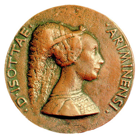 Matteo de' Pasti, was an artist and builder from Verona and follower of Pisanello. The portrait medal that he made for Sigismond Malatesta, the ruler of the city-state of Rimini, was a new form of art in the time it was made. It shows Isotta degli Atti, the daughter of a rich merchant, whom Sigismondo fell in love with when she was 13. Elevating her to the position of formal mistress, he finally married her after the death of his wife Pelissena Sforza in 1449, choosing love above a new dynastic marriage.