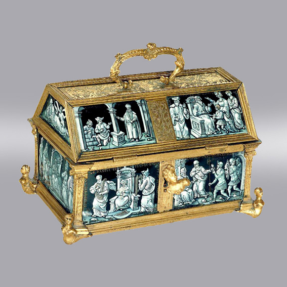 A gilded bronze frame was mounted on the wooden base of a casket into which were inserted copper panels painted in enamel in the grisaille technique. The rich ornamentation of the frame is full of details in the Mannerist style: pillars with capitals, legs shaped like herms, engraved trophies and intricate vine-like and floral ornaments.