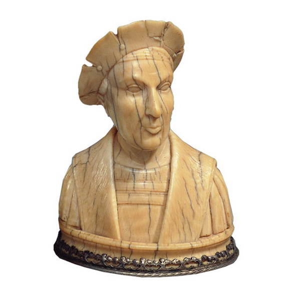 The bust is carved together with the base from a single piece of ivory. The date 1530 is engraved on the base which is encircled by a metal frame. The man is wearing a tunic and cloak with a Renaissance cap on his head. The face is realistic, the expression thoughtful and neutral, the head slightly inclined casting a shadow.