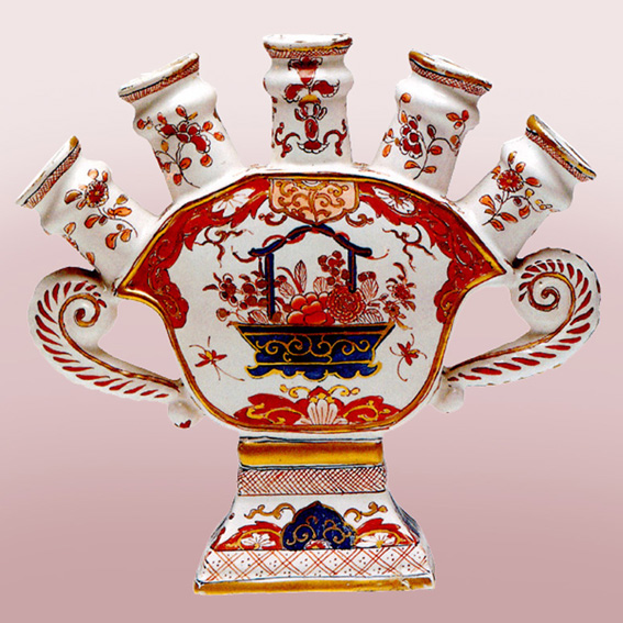 466 Tulip Vase Delft; workshop Die griekische A; ca. 1725 The tulip vase is an original Dutch product. This vase is of the fan type, as seen in the arrangement of the holes for the flowers.