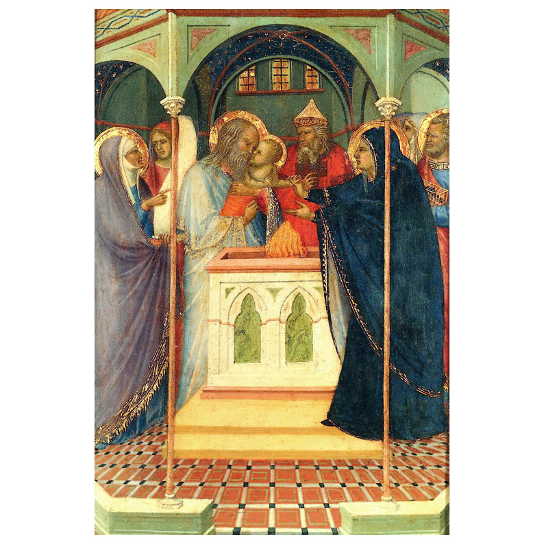 The Presentation in the Temple was a popular subject in European painting throughout the 14th c. It was taken from the Gospel of Luke, when Christ, the first-born Child, was presented at the Temple according to the law of Moses, with the decreed redemptory sacrifice of the poor: a pair of turtle-doves. Thereupon Simeon recognized Jesus as the promised Messiah and prophesied to Mary that a sword of pain would pierce her soul.