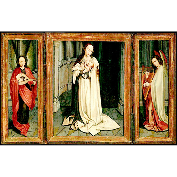The architectural elements suggest one space of the same church continuing through all three parts of the triptych, which probably served as a devotional painting on a home altar. The subject of the painting appeared in numerous and varied versions in Flemish art down to 1520, as a single picture more often than as a triptych. It is supposed that it's prototype was the lost painting by Robert Campin (Master of Flémalle), one of the founders of 15th c. Flemish art. This triptych belongs to a specific current of Flemish painting (1490-1520) in which artists strove to revive old Flemish art of the 1st half of the 15th c. The peak of this archaic revival was reached around 1510.