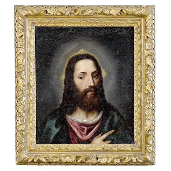 Titian's pupil painted this half-length picture of Christ in the spirit of his great teacher. It shows powerful contrasts of light and dark and of colour, showing Christ in a red robe and green cloak. The flesh colour and fabric are executed in fine shading. This portrayal of Christ, with large, dreaming eyes, long, dark hair and regular features is influenced by Titian's portrayal of Jesus. The background is grey, Christ's head framed in short gold rays. The painting, although simple and condensed, conveys the immensity of Christ.