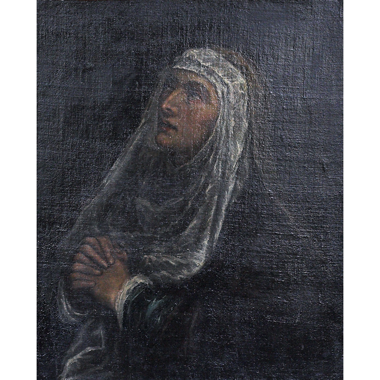 The painting features an early Baroque portrayal of the Virgin as a mother mourning for the Passion and Death of Christ. The dramatic effect is achieved by the strong lines and gestures of the face, the hands clasped in prayer and the tears. The dramatic imagery is further accentuated by contrasting the warm dark-brown tones to the light ones on the Virgin's silvery-white scarf and ivory face. This type of Virgin stems from the Venetian High Renaissance Madonna with emphasized sharp facial features.