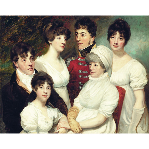 The members of the Wellington family were portrayed by Hoppner against a turbulent sky, in the courtly fashion of the English Rococo style. The figures resemble each other in their Classical features, ivory complexions and rosy cheeks. They are arranged in a semi-circular composition. The subtle white hues of their silk gowns dominate the painting, set in simple contrast to red and dark brown colours without contour lines. This group portrait is unique for its free expression in pure colours and broad brush-strokes.