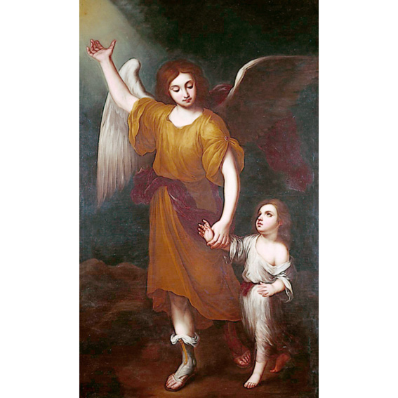 The guardian angel, with his gentle face and light walk is leading a small boy through a rocky pass discernible in the browns of the background. The angel holds him by the left hand, and with the right hand is pointing upwards to the light on which the boy fixes his gaze. The subject of a guardian angel watching over people from birth to death was a favourite one in the 17th c. and much fostered by the Jesuits. It has its roots in the iconography of Tobias and the Archangel Raphael and emerged as a subject in its own right in the 16th c. at the time of the religious wars.