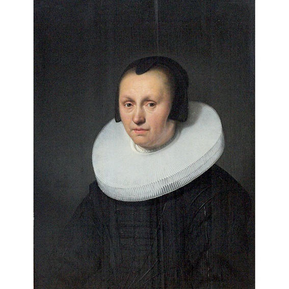 A realistic portrait of a Dutch woman in the fashionable clothing of the 17th c., in three-quarter profile against a dark background. Most clearly picked out are her pale face and grey-white, fluted and starched ruff. The rose and yellow flesh tones are finely interspersed with the grey of the shadows. She is wearing a typical Dutch cap over brown hair. The drawing is firm and the shadows softly toned. Tonal colour values are consistently executed.