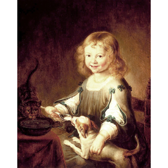 A delightful genre scene from everyday life: a small blond girl spoon-feeds a dog, while a cat laps up milk from a shallow dish. The girl is turned towards the viewer, as if standing on a stage, with a broad smile and direct gaze that seems to invite the observer to join in this happy scene.