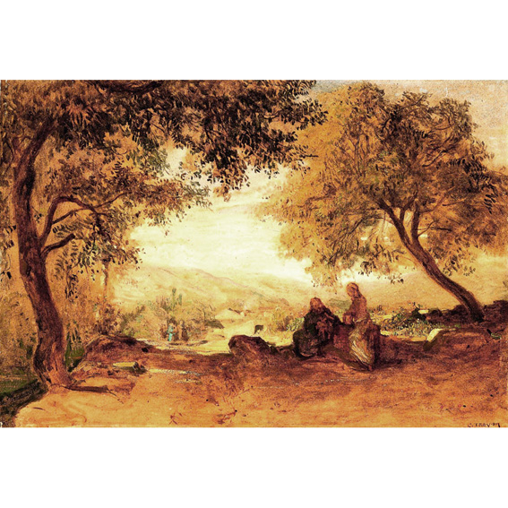 On a wide elevation in the foreground Christ and the woman of Samaria are talking beside the well. The scene is shaded by the immense crowns of two trees beyond which the view stretches towards a sunlit valley with village houses, human figures and a hilly skyline under a cloudy sky. This division of space with clearly bounded, gradually illuminated and subtly linked bands is a debt to the classical landscape of the great Venetians and Claude Lorrain.