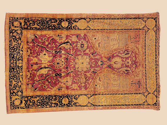 The rug is of characteristic size, and the decorative composition is a fine combination of Persian and Ottoman motifs. It is of special interest because of the nature of the quotations. These are not the usual texts from the Qur'an but are philosophic and poetic.